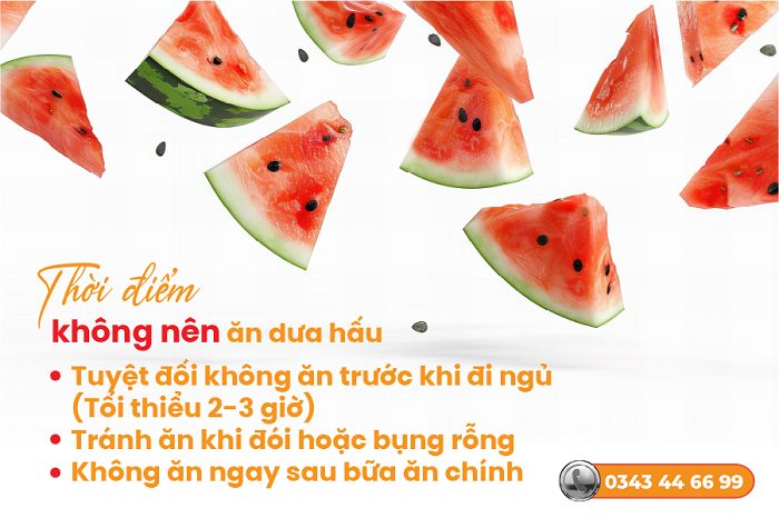 Kết hợp không phù hợp | Ăn dưa hấu cùng với các thực phẩm gây trào ngược mạnh (như đồ chiên rán, cay nóng, thực phẩm béo, cà phê). | Giải pháp: Ăn dưa hấu đơn lẻ hoặc chỉ kết hợp với các thực phẩm kiềm tính (sữa chua không đường, chuối). |