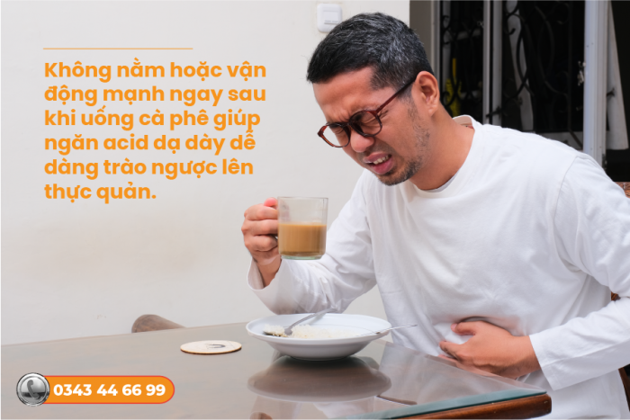 - Không nằm hoặc vận động mạnh ngay sau khi uống cà phê: Tránh nằm, cúi gập người, hoặc mặc quần áo quá chật trong vòng 2-3 giờ sau khi uống cà phê. Việc này giúp ngăn acid dạ dày dễ dàng trào ngược lên thực quản.