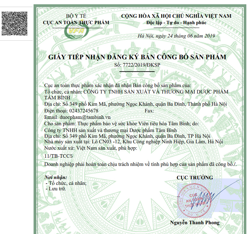 Sản xuất và chịu trách nhiệm sản phẩm: CÔNG TY TNHH SX & TM DƯỢC PHẨM TÂM BÌNH